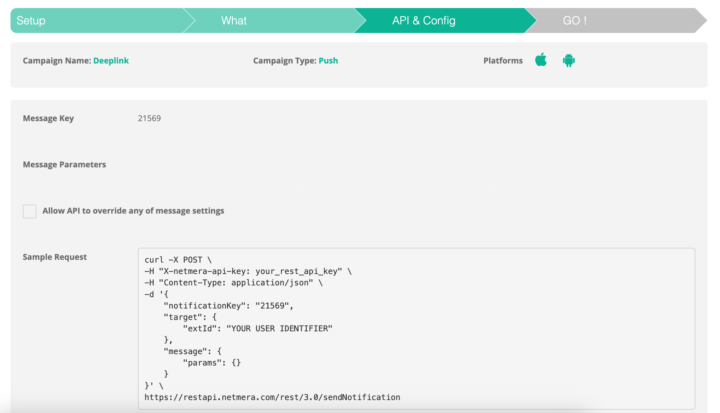1. On API & Config step, acquire the sample request for sending via the REST API.