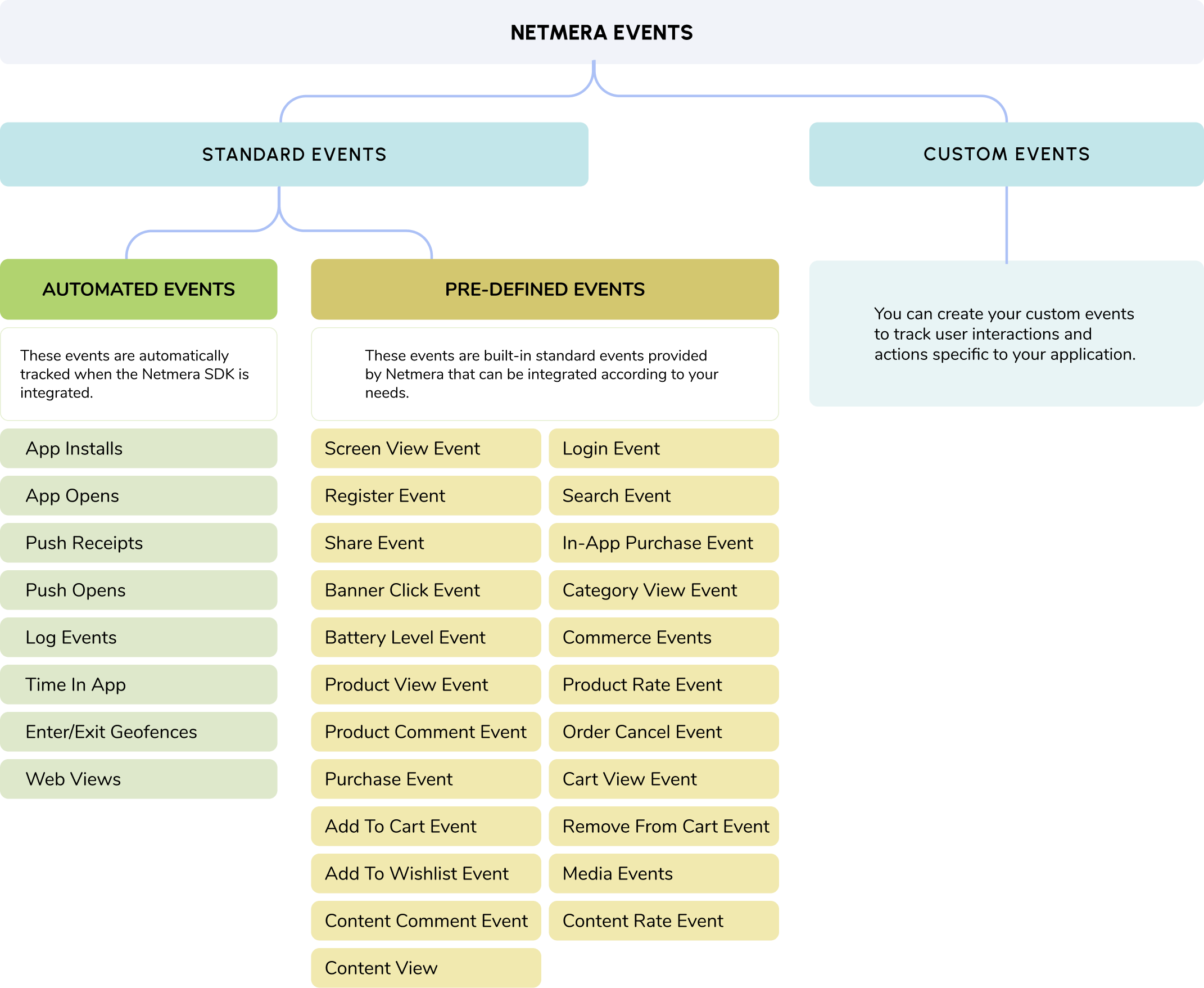 Netmera offers a complete set of trackable events, giving you valuable insights into user behavior and app performance. These events fall into two main categories: Standard Events, which include Automated and Pre-defined Events and Custom Events.