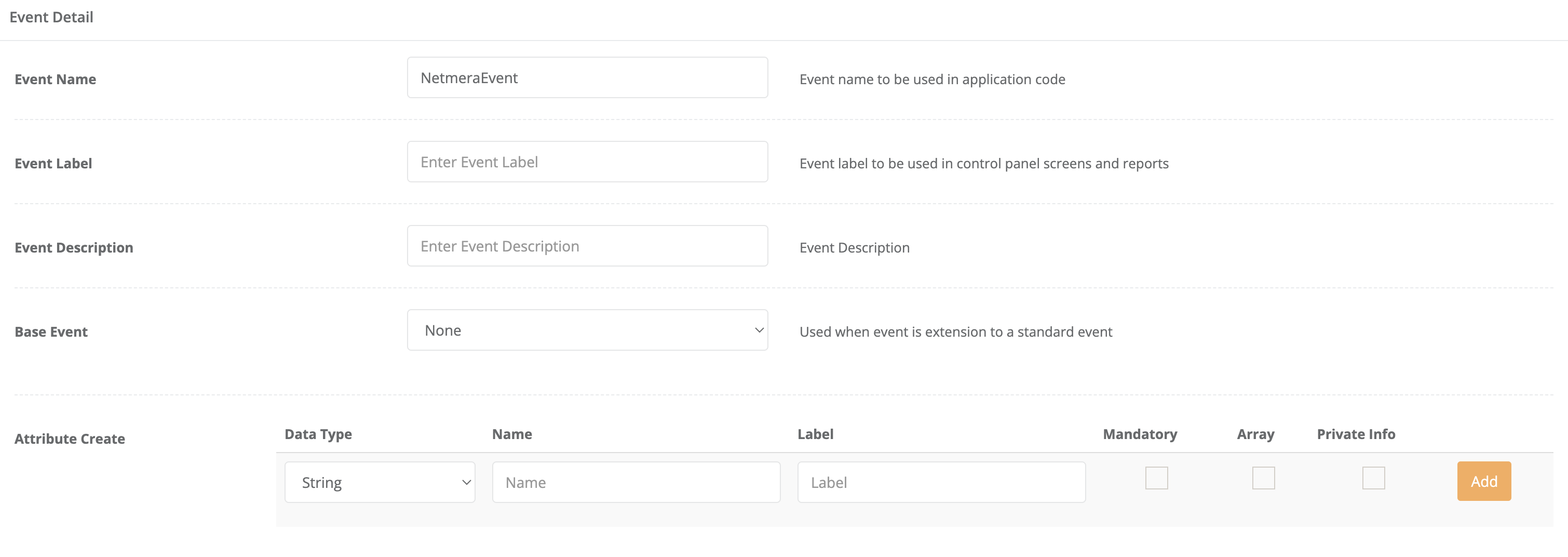 Go to the Netmera Panel and navigate to Developers > Events > Create New Event section.