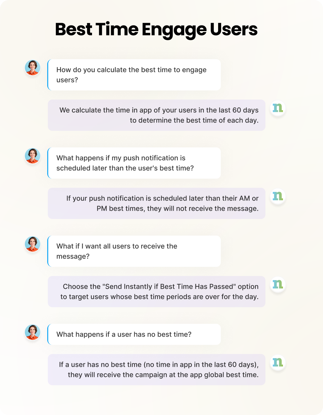 | **App Global Best Time**                   | The hour of the day when most users are active for that weekday, used when user data is **unavailable** or if all **AM/PM or daily best time** periods have passed for the user. |