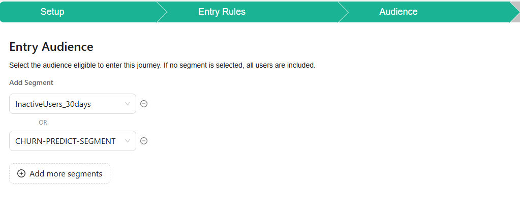 If no specific segment is selected, the journey will be applicable to all users. This allows for flexibility in targeting and ensures that the journey can be tailored to meet the specific needs of different user groups.