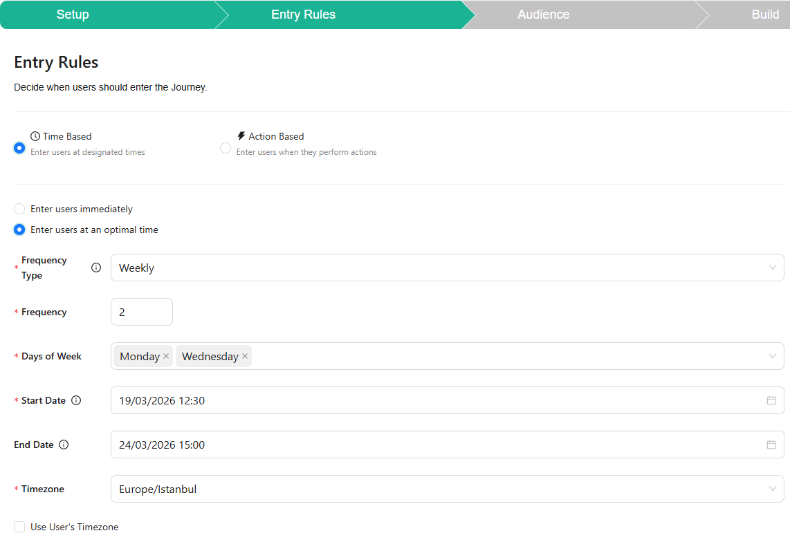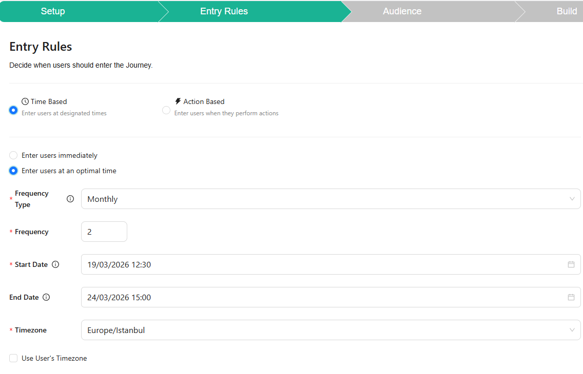 In the **Time-Based** option, users are expected to enter the journey at specific times or intervals. The journey operates on a scheduled time frame, with different use cases tailored to your needs. Some examples include: