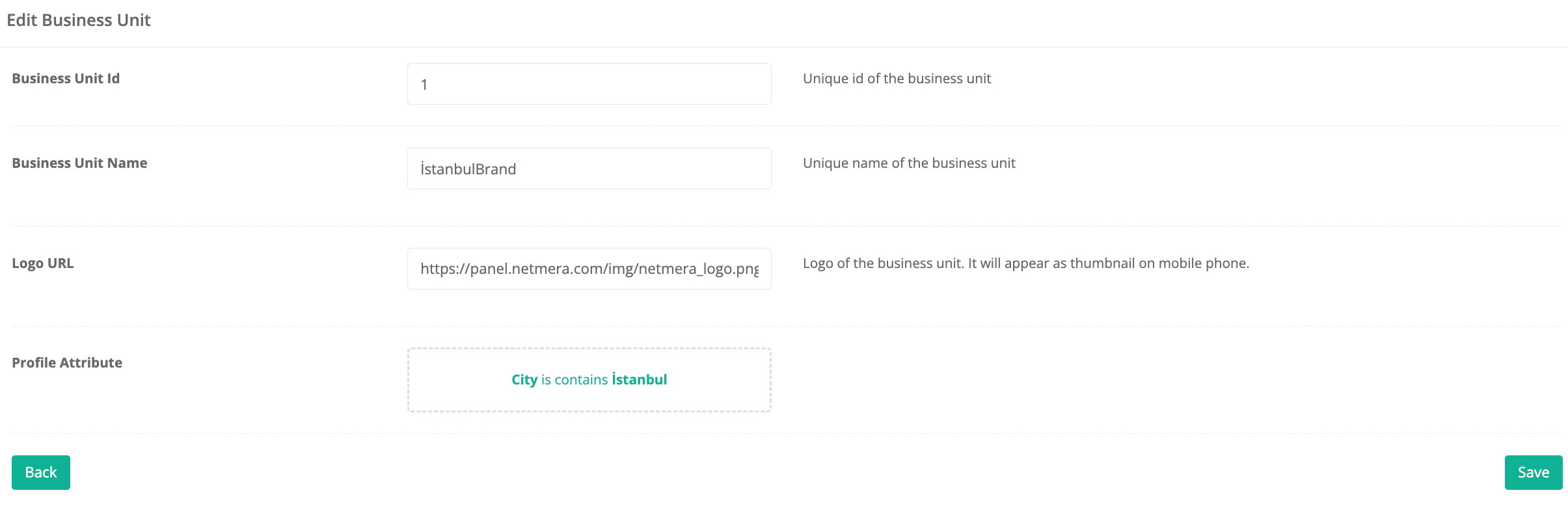 A "Business Unit Id" is a unique identifier automatically assigned to each business unit by Netmera. It serves as a primary key to distinguish one business unit from another within the system.