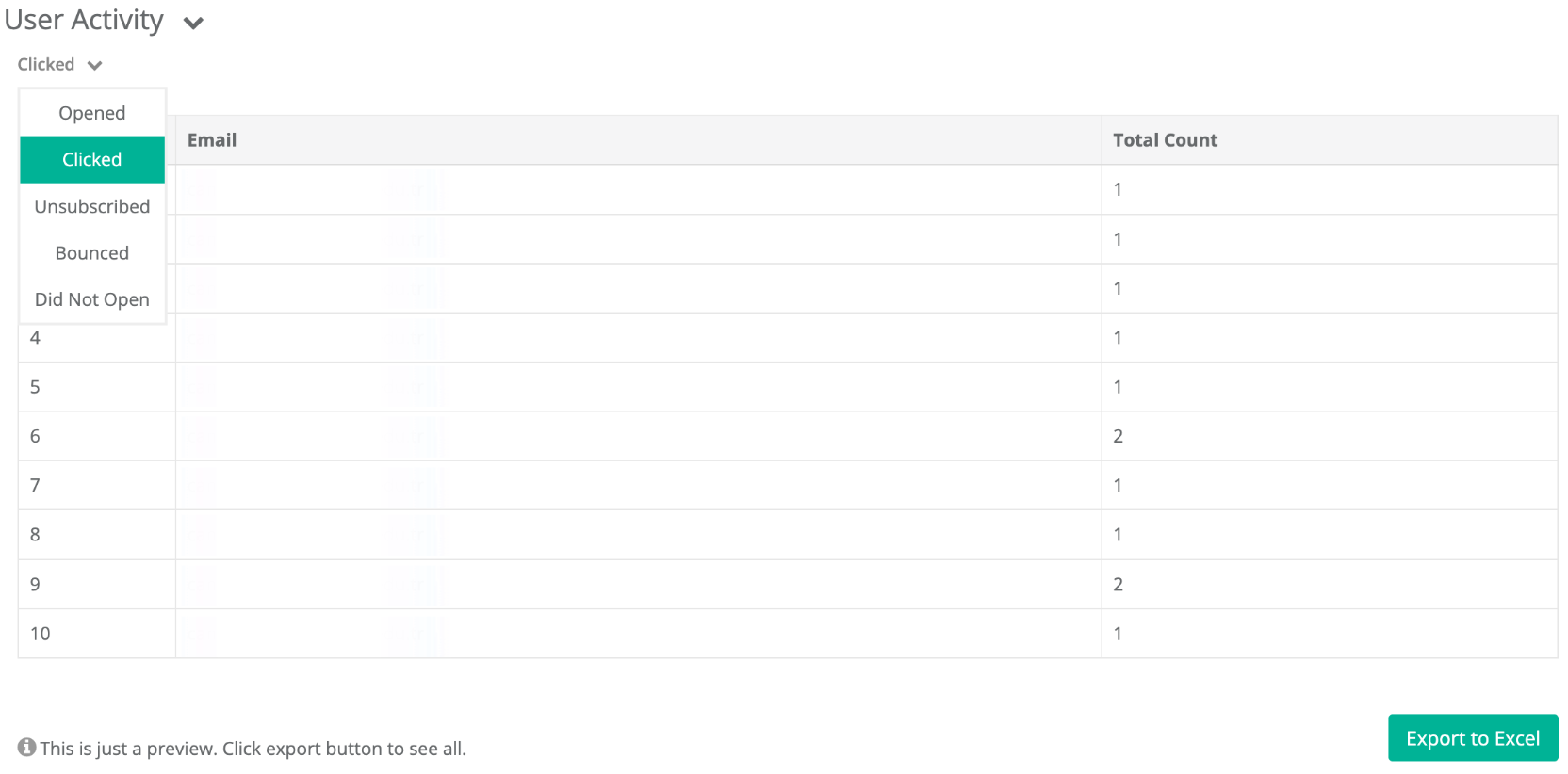 The User Activity section allows you to review how recipients interacted with your email campaign at an individual level. By selecting the metric from the dropdown menu, you can see detailed data regarding the metrics you choose made by individual recipients.