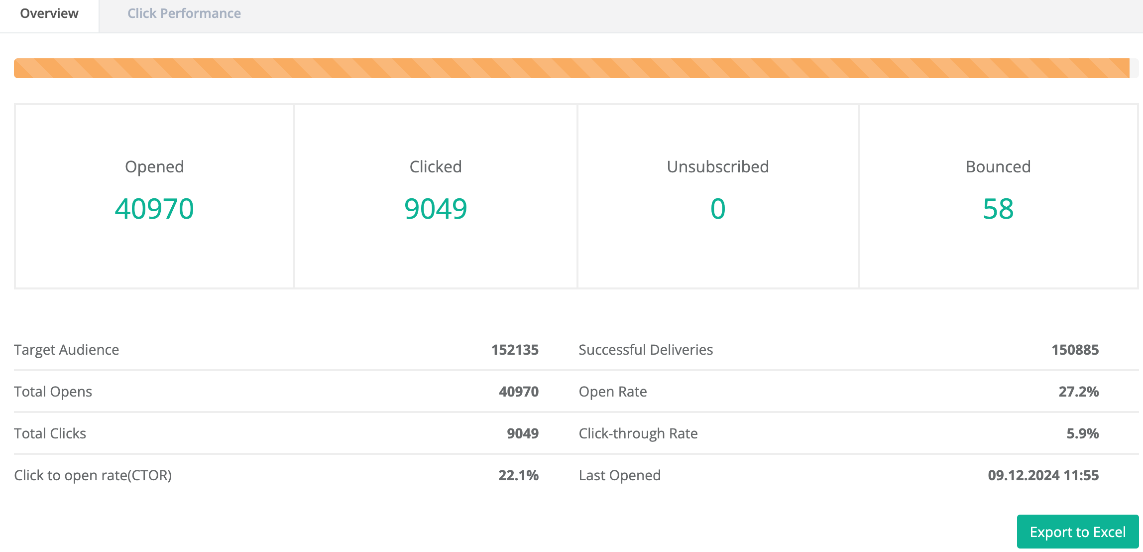 The Overview section provides performance metrics that reflect how recipients engaged with the email. These indicators help assess strategy effectiveness, content resonance, and list health.