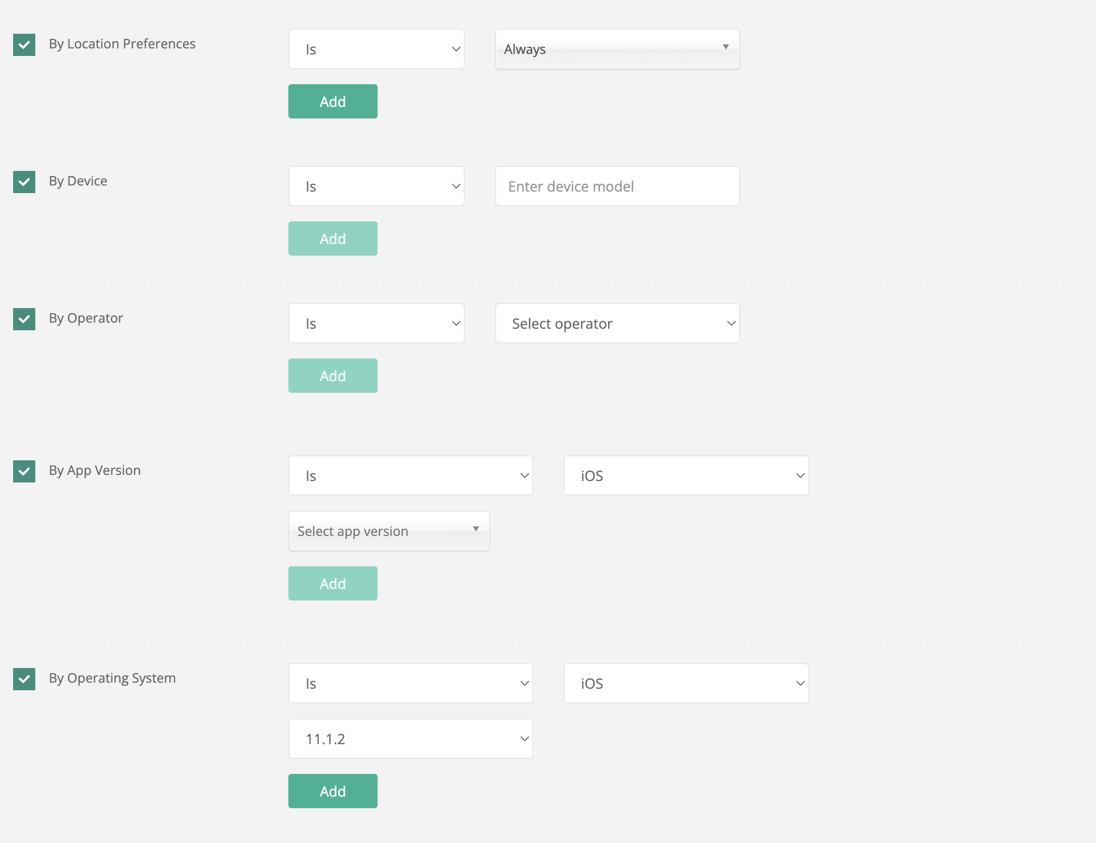 * **Operating System**: OS version level targeting (for example iOS 17+).