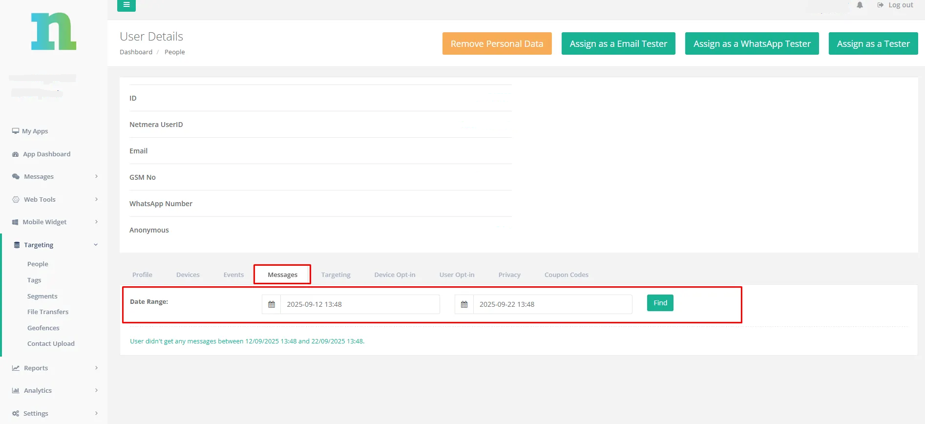The Messages tab shows the user’s message history for a selected date range. It is useful for support, audits, and troubleshooting.
